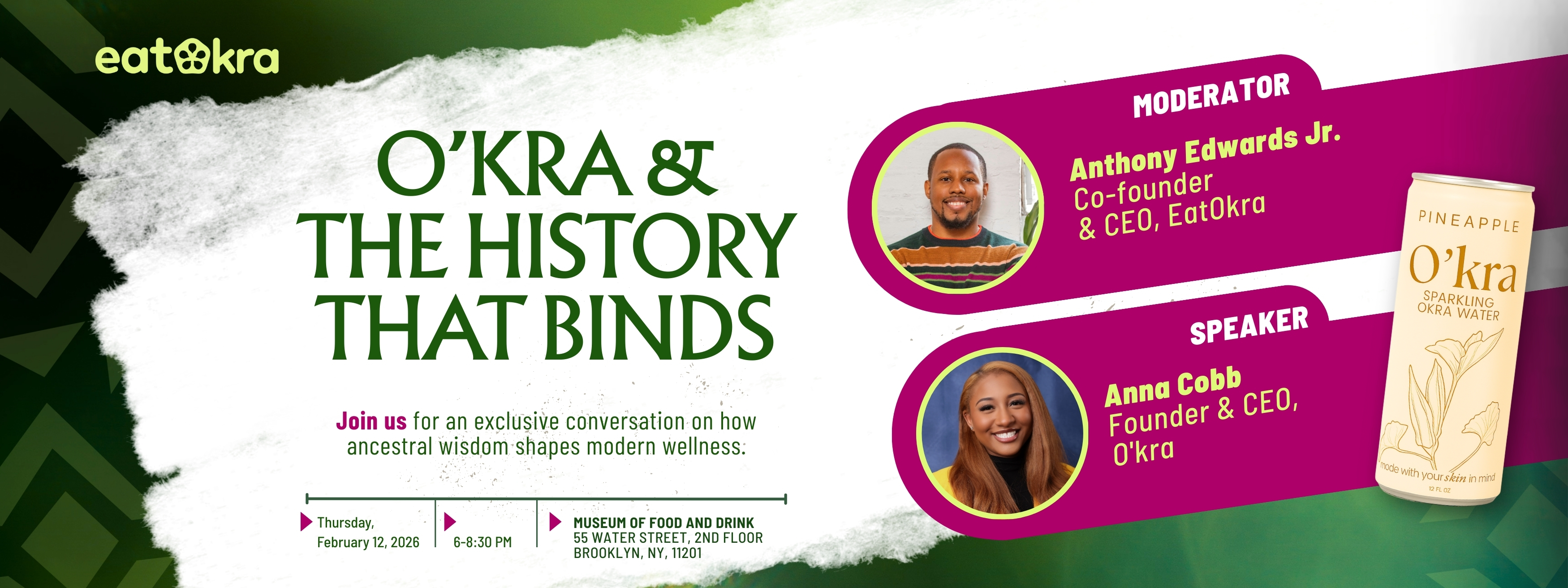To help honor okra and the history and diaspora it binds, we powered an event featuring Anna Cobb, the visionary behind O'kra Sparkling Water, and Anthony Edwards Jr., Co-founder & CEO of EatOkra at the Museum of Food and Drink in Brooklyn—a discussion around how our ancestors' wisdom is still feeding us today, literally and figuratively. Stay tuned for the recap!